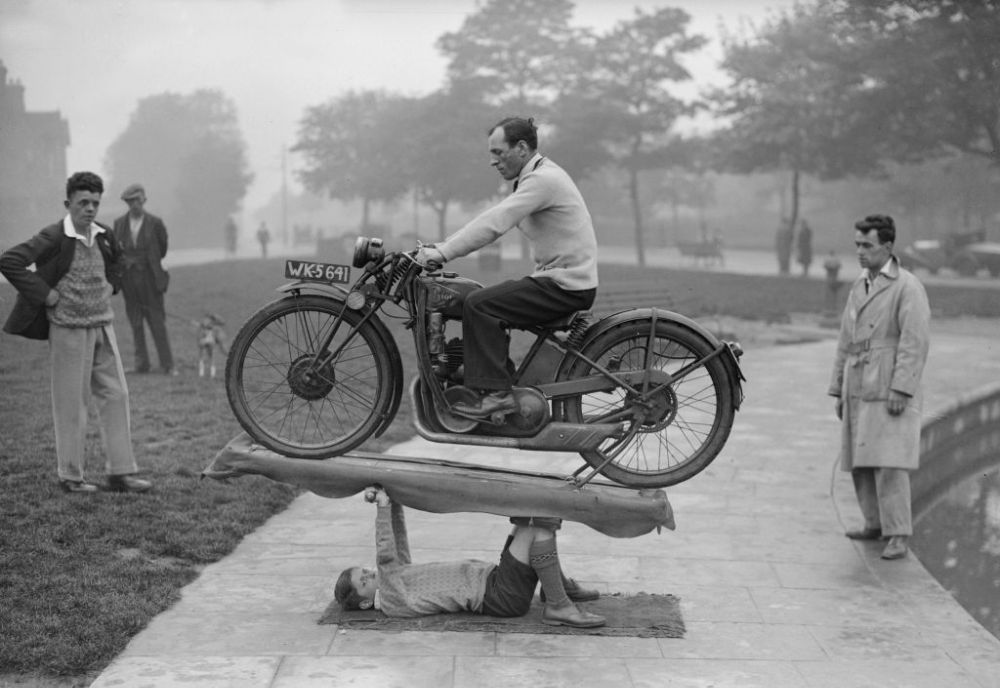A 14-year-old boy supports a 200-lb-motorcycle and its rider, circa 1932.