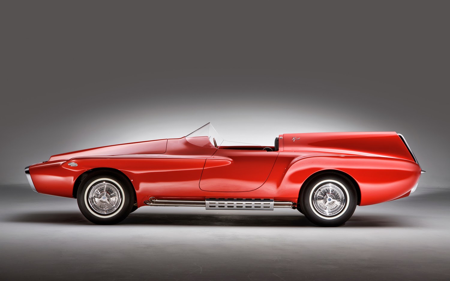 This concept car was built in 1959 by Ghia and was presented in 1960. The red XNR, designed by Virgil M. Exner, was powered by a 170 Slant-Six engine prepared to NASCAR specs, which pumped out 250 horsepower. On Chrysler's testing track, the car had a top speed of 150 mph.